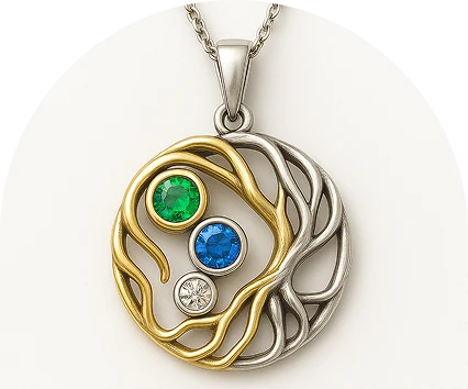 Unikalny produkt, którego korzenie sięgają czasów starożytnych. Dwie różne części biżuterii ze złota i srebra najwyższej próby, przeplatające się w formie korzeni drzewa. Całość uzupełniają szlachetne kamienie. Projekt stworzony w oparciu o naturalny styl, który niesie ze sobą prostotę i niewypowiedziane piękno.