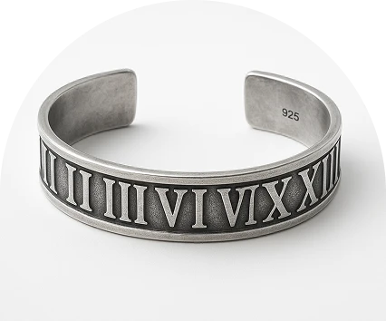 Wykonana ze srebra próby 925 w agresywnym i szerokim stylu. Uzupełniona rzymskimi cyframi wyrytymi wokół bransoletki.